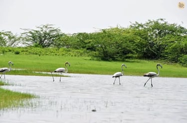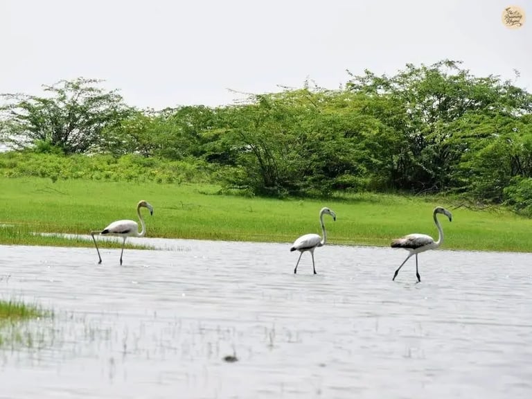 Beyond flamingos, the lake hosts a rich mix of avian life: Black-Winged Stilts, Redshanks, Avocets, Sandpipers, Coots, and Plovers. In the surrounding scrublands, keen eyes may spot Indian Coursers, Black Ibises, and Sandgrouse, while foxes, jackals, and blue bulls occasionally wander the edges, adding a hint of wilderness to the scene.